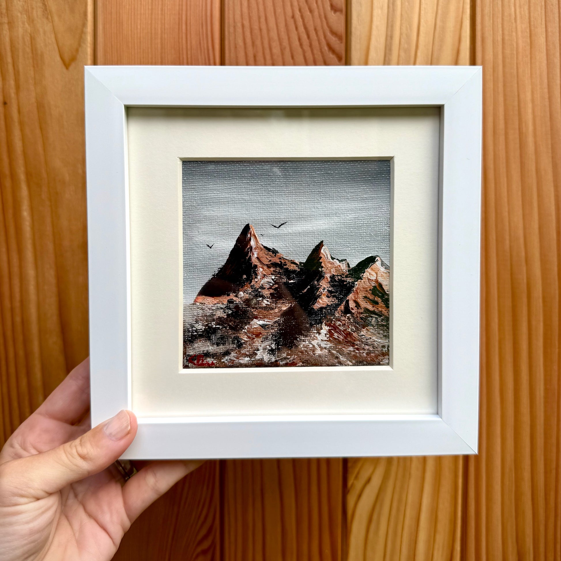 4x4” artwork in a 6x6” box frame.